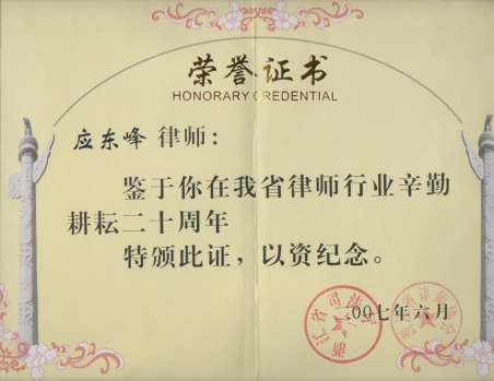 浙江省司法廳、省律協授予應東峰律師“律師執業二十年”榮譽證書和銀質獎章