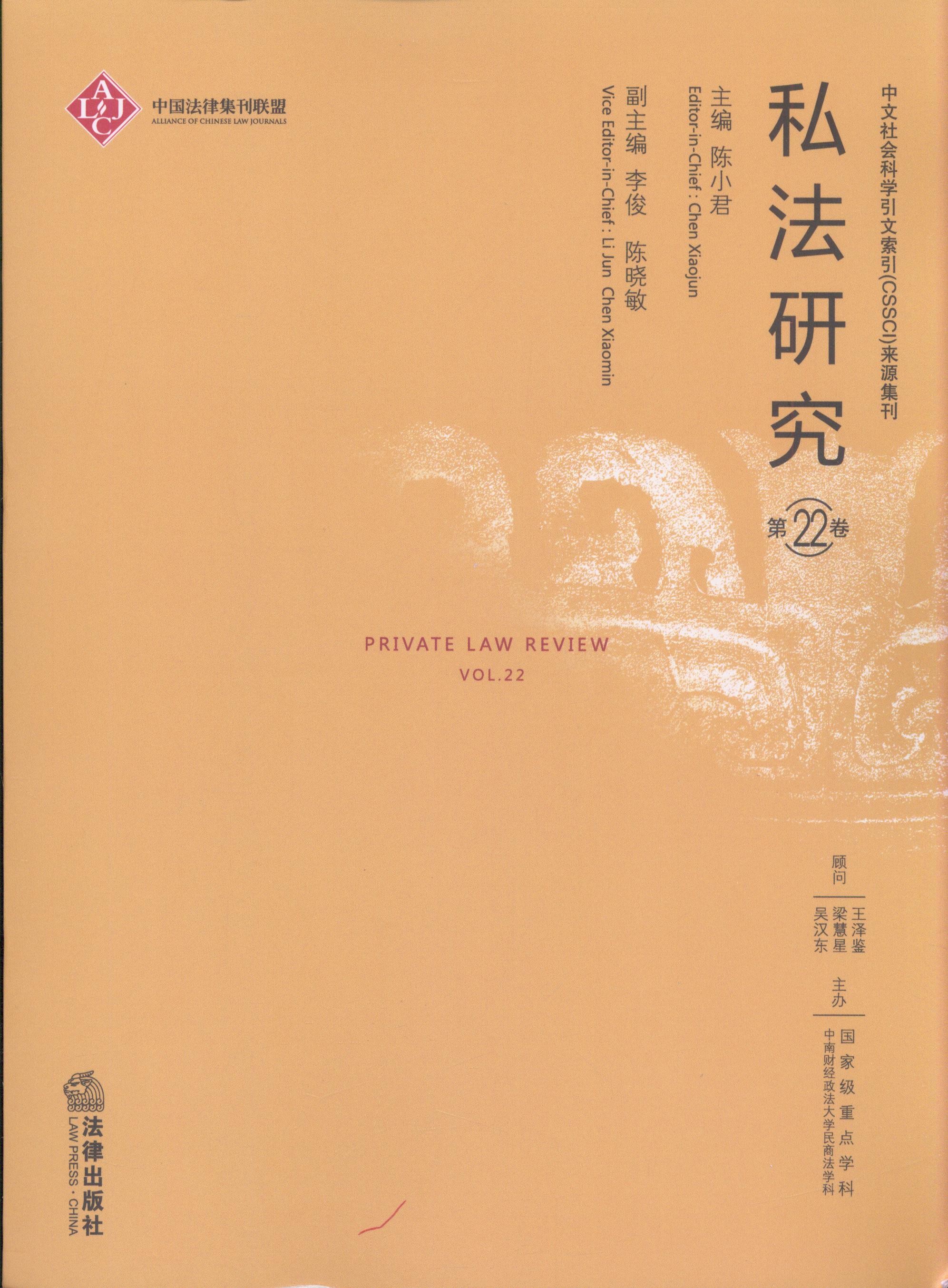 《私法研究(第22卷)》為連續出版物,入選中文社會科學引文索引CSSCI來源集刊。第22卷設有“民事法論”“知識產權法專論”“環境資源法專論”等專題欄目,共收入文章14篇。其中,既有反映私法領域新近研究熱點的文章,也有從歷史脈絡梳理法律發展的文章,還有從域外角度闡述法律制度以比較研究的文章,特別重視推出對現實問題在研究方法上有創新性的成果。在堅持研究傳統問題的同時,對于與私法有關的交叉領域也給與關注,重視多樣性學術探討。